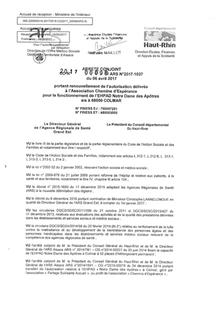 portant renouvellement de l'autorisation délivrée à l'association Chemins d'Espérance pour le fonctionnement de l'EHPAD Notre Dame des Apôtres sis à 68000 COLMAR Resumé Pièces jointes ARRETE Assemblée : Non défini Date : 06/04/2017 Rapporteur : Non défini Collectivité : Conseil départemental du Haut-Rhin Direction : Non défini Service : Direction de la Solidarité Domaine : Autres (non classés) Commission :