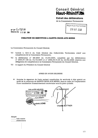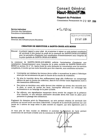 le présent rapport a pour objet de m'autoriser à signer un acte portant constitution de servitude à titre gratuit au profit de la commune de SAINTE-CROIX-AUX-MINES pour lui permettre d'implanter une canalisation d'assainissement sous l'emprise de la piste cyclable de SAINTE-CROIX-AUX-MINES.