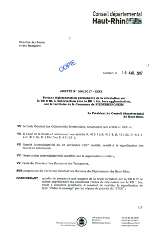 portant réglementation permanente de la circulation sur la RD 8 III, à l'intersection avec la RD 1bis, hors agglomération, sur le territoire de la commune de NIEDERHERGHEIM Resumé Pièces jointes ARRETE Assemblée : Non défini Date : 10/04/2017 Rapporteur : Non défini Collectivité : Conseil départemental du Haut-Rhin Direction : Non défini Service : Direction des Routes Domaine : Circulation Commission :