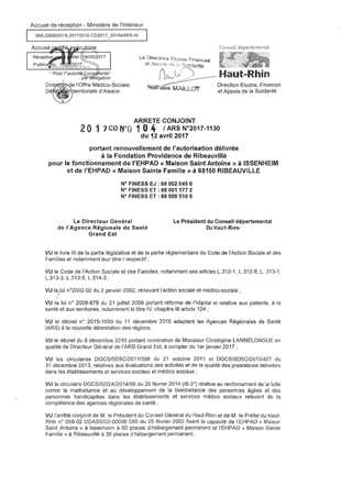 portant renouvellement de l'autorisation délivrée à la fondation Providence de RIBEAUVILLE pour le fonctionnement de l'EHPAD "Maison Saint Antoine" à ISSENHEIM et de l'EHPAD "Maison Sainte Famille" à 68150 RIBEAUVILLE Resumé Pièces jointes ARRETE Assemblée : Non défini Date : 12/04/2017 Rapporteur : Non défini Collectivité : Conseil départemental du Haut-Rhin Direction : Non défini Service : Direction de la Solidarité Domaine : Autres (non classés) Commission :