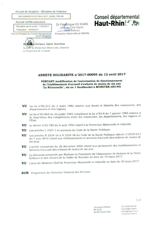 portant modification de l'autorisation de fonctionnement de l'établissement d'accueil d'enfants de moins de six ans "La Ritournelle", sis au 1 Sandbuckel à MUNSTER (68140) Resumé Pièces jointes ARRETE Assemblée : Non défini Date : 12/04/2017 Rapporteur : Non défini Collectivité : Conseil départemental du Haut-Rhin Direction : Non défini Service : Direction Enfance Santé Insertion Domaine : Accueil d'enfants Commission :