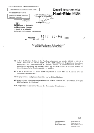 portant fixation des prix de journée 2017 de la Cité de l'Enfance à COLMAR Resumé Pièces jointes ARRETE Assemblée : Non défini Date : 24/04/2017 Rapporteur : Non défini Collectivité : Conseil départemental du Haut-Rhin Direction : Non défini Service : Direction Etudes, Finances et Appuis de la Solidarité Domaine : Prix de Journée Commission :