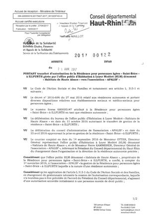 portant transfert d'autorisation de la résidence pour personnes âgées "Saint-Brice" à ILLFURTH gérée par l'office d'Habitation à Loyer Modéré (HLM) dénommé "Habitats de Haute Alsace" vers l'association "APALIB" Resumé Pièces jointes ARRETE Assemblée : Non défini Date : 26/04/2017 Rapporteur : Non défini Collectivité : Conseil départemental du Haut-Rhin Direction : Non défini Service : Direction Etudes, Finances et Appuis de la Solidarité Domaine : Personnes Agées Commission :
