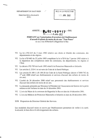Portant sur l'autorisation d'ouverture de l'établissement d'accueil d'enfants de moins de six ans "Tom Pouce" sis au 2 rue d'Oberdorf à Hagenthal-le-Bas Resumé Pièces jointes ARRETE Assemblée : Non défini Date : 03/01/2002 Rapporteur : Non défini Collectivité : Conseil départemental du Haut-Rhin Direction : Non défini Service : Direction de la Solidarité Domaine : Accueil d'enfants Commission :