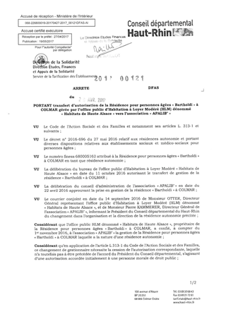 portant transfert d'autorisation de la résidence pour personnes âgées "Bartholdi" à COLMAR gérée par l'office public d'Habitation à Loyer Modéré (HLM) dénommé "Habitats de Haute Alsace" vers l'association "APALIB" Resumé Pièces jointes ARRETE Assemblée : Non défini Date : 26/04/2017 Rapporteur : Non défini Collectivité : Conseil départemental du Haut-Rhin Direction : Non défini Service : Direction Etudes, Finances et Appuis de la Solidarité Domaine : Personnes Agées Commission :