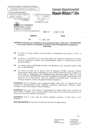 portant fermeture de la résidence pour personnes âgées "Bois Joli" à RICHWILLER en tant que résidence autonomie et portant sortie du dispositif des résidences autonomie. Resumé Pièces jointes ARRETE Assemblée : Non défini Date : 26/04/2017 Rapporteur : Non défini Collectivité : Conseil départemental du Haut-Rhin Direction : Non défini Service : Direction Etudes, Finances et Appuis de la Solidarité Domaine : Personnes Agées Commission :