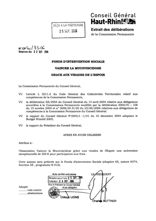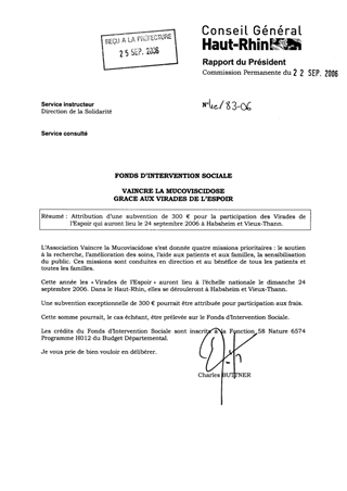 Attribution d’une subvention de 300 € pour la participation des Virades de l’Espoir qui auront lieu le 24 septembre 2006 à Habsheim et Vieux-Thann.