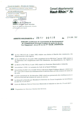 portant modification de l'autorisation de fonctionnement de l'établissement d'accueil d'enfants de moins de six ans "Les Cigogneaux", sis au 25 rue du 4ème R.S.M. à ROUFFACH Resumé Pièces jointes ARRETE Assemblée : Non défini Date : 26/04/2017 Rapporteur : Non défini Collectivité : Conseil départemental du Haut-Rhin Direction : Non défini Service : Direction Enfance Santé Insertion Domaine : Accueil d'enfants Commission :