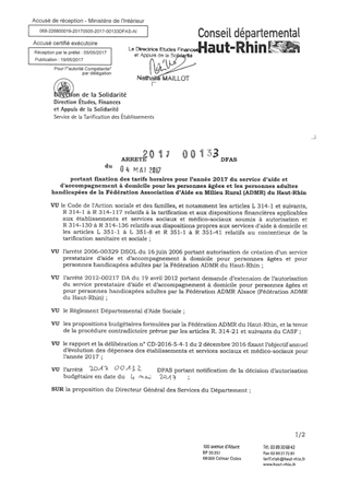 portant fixation des tarifs horaires pour l'année 2017 du service d'aide et d'accompagnement à domicile pour les personnes âgées et les personnes adultes handicapées de la fédération association d'aide en milieu rural (ADMR) du Haut-Rhin Resumé Pièces jointes ARRETE Assemblée : Non défini Date : 04/05/2017 Rapporteur : Non défini Collectivité : Conseil départemental du Haut-Rhin Direction : Non défini Service : Direction Etudes, Finances et Appuis de la Solidarité Domaine : Prix de Journée Commission :