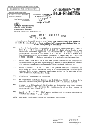 portant fixation des tarifs horaires pour l'année 2017 des services d'aide ménagère au profit des bénéficiaires de l'aide sociale de la fédération association d'aide en milieu rural (ADMR) du Haut-Rhin Resumé Pièces jointes ARRETE Assemblée : Non défini Date : 04/05/2017 Rapporteur : Non défini Collectivité : Conseil départemental du Haut-Rhin Direction : Non défini Service : Direction Etudes, Finances et Appuis de la Solidarité Domaine : Prix de Journée Commission :