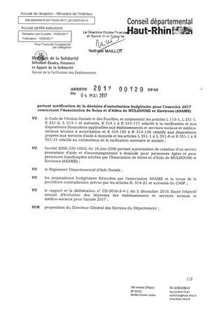 portant notification de la décision d'autorisation budgétaire pour l'exercice 2017 concernant l'Association des soins et d'aides de MULHOUSE et environs (ASAME) Resumé Pièces jointes ARRETE Assemblée : Non défini Date : 04/05/2017 Rapporteur : Non défini Collectivité : Conseil départemental du Haut-Rhin Direction : Non défini Service : Direction Etudes, Finances et Appuis de la Solidarité Domaine : Dotations financières Commission :