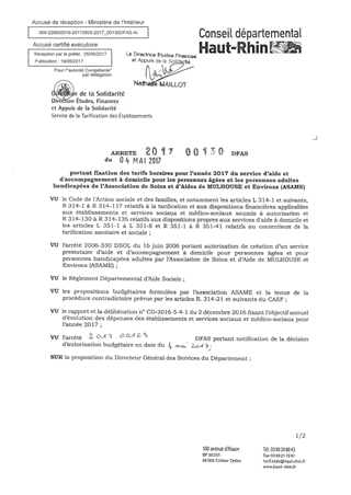portant fixation des tarifs horaires pour l'année 2017 du service d'aide et d'accompagnement à domicile pour les personnes âgées et les personnes adultes handicapées de l'association de soins et d'aides de MULHOUSE et environs (ASAME) Resumé Pièces jointes ARRETE Assemblée : Non défini Date : 04/05/2017 Rapporteur : Non défini Collectivité : Conseil départemental du Haut-Rhin Direction : Non défini Service : Direction Etudes, Finances et Appuis de la Solidarité Domaine : Prix de Journée Commission :