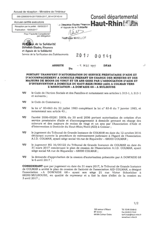 portant transfert d'autorisation du service prestataire d'aide et d'accompagnement à domicile prenant en charge des mineurs et des majeurs de moins de vingt et un ans géré par l'association d'aide et d'intervention à domicile du Haut-Rhin/ Nord (AID) à CO