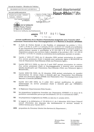 portant notification de la décision d'autorisation budgétaire pour l'exercice 2017 concernant l'association pour l'accompagnement et la maintien à domicile (APAMAD) Resumé Pièces jointes ARRETE Assemblée : Non défini Date : 05/05/2017 Rapporteur : Non défini Collectivité : Conseil départemental du Haut-Rhin Direction : Non défini Service : Direction Etudes, Finances et Appuis de la Solidarité Domaine : Dotations financières Commission :