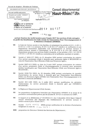portant fixation des tarifs horaires pour l'année 2017 des services d'aide ménagère au profit des bénéficiaires de l'aide sociale de l'association pour l'accompagnement et le maintien à domicile (APAMAD) Resumé Pièces jointes ARRETE Assemblée : Non défini Date : 05/05/2017 Rapporteur : Non défini Collectivité : Conseil départemental du Haut-Rhin Direction : Non défini Service : Direction Etudes, Finances et Appuis de la Solidarité Domaine : Dotations financières Commission :