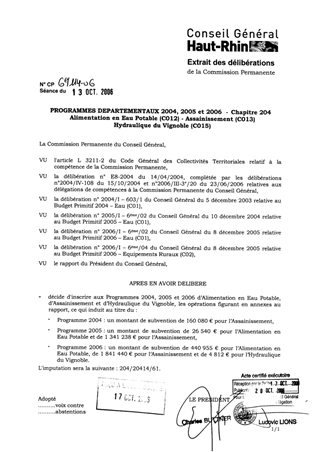 Après examen par la 6ème Commission des dossiers présentés au titre des programmes 2004, 2005 et 2006, il vous est proposé de programmer les opérations dont l'ordre de service nous est parvenu, ce qui induit au titre du programme : - 2004 : un montant de subvention de 160 080 € pour l’Assainissement, - 2005 : un montant de subvention de 26 540 € pour l’Alimentation en Eau Potable et de 1 341 238 € pour l’Assainissement, - 2006 : un montant de subvention de 440 955 € pour l’Alimentation en Eau Potable, de 1 841 440 € pour l’Assainissement et de 4 812 € pour l’ Hydraulique du Vignoble.