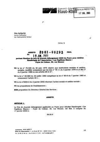 portant fixation du prix de journée hébergement 2003 du foyer pour adultes handicapés de l'Association "Les Papillons Blancs" Foyer de Colmar 30, rue Henner. Resumé Pièces jointes ARRETE Assemblée : Non défini Date : 16/07/2003 Rapporteur : Non défini Collectivité : Conseil départemental du Haut-Rhin Direction : Non défini Service : Service de la Tarification des Etablissements Domaine : Prix de Journée Commission :