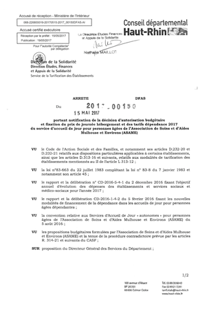 portant notification de la décision d'autorisation budgétaire et fixation du prix de journée hébergement et des tarifs dépendance 2017 du service d'accueil de jour pour personnes âgées de l'association de soins et d'aides MULHOUSE et environs (ASAME)