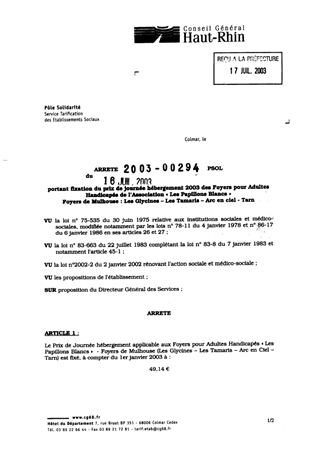 portant fixation du prix de journée hébergement 2003 des foyers pour adultes handicapés de l'association "Les Papillons Blancs" Foyers de MULHOUSE : Les Glycines - Les Tamaris - Arc en Ciel - Tarn. Resumé Pièces jointes ARRETE Assemblée : Non défini Date : 16/07/2003 Rapporteur : Non défini Collectivité : Conseil départemental du Haut-Rhin Direction : Non défini Service : Service de la Tarification des Etablissements Domaine : Prix de Journée Commission :