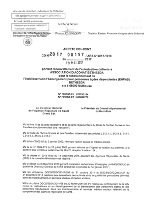 portant renouvellement de l'autorisation délivrée à Association Diaconat Bethesda pour le fonctionnement de l'établissement d'hébergement pour personnes âgées dépendantes (EHPAD) Bethesda sis à 68090 MULHOUSE Resumé Pièces jointes ARRETE Assemblée : Non défini Date : 19/05/2017 Rapporteur : Non défini Collectivité : Conseil départemental du Haut-Rhin Direction : Non défini Service : Direction de la Solidarité Domaine : Personnes Agées Commission :