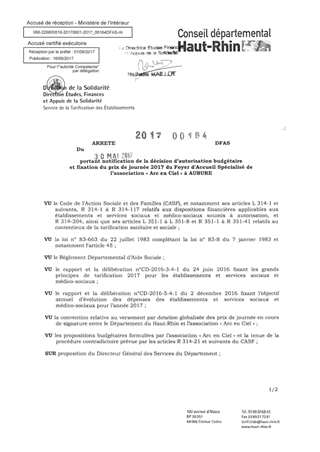 portant notification de la décision d'autorisation budgétaire et fixation du prix de journée 2017 du foyer d'accueil spécialisé de l'association "Arc en Ciel" à AUBURE Resumé Pièces jointes ARRETE Assemblée : Non défini Date : 30/05/2017 Rapporteur : Non défini Collectivité : Conseil départemental du Haut-Rhin Direction : Non défini Service : Direction Etudes, Finances et Appuis de la Solidarité Domaine : Prix de Journée Commission :