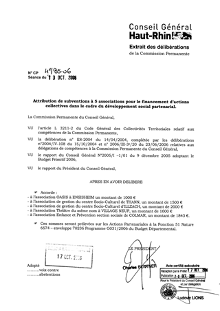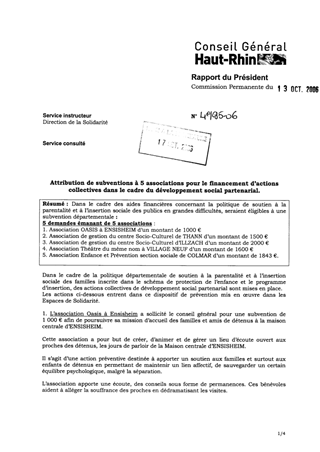 Dans le cadre des aides financières concernant la politique de soutien à la parentalité et à l’insertion sociale des publics en grandes difficultés, seraient éligibles à une subvention départementale : 5 demandes émanant de 5 associations : 1. Association OASIS à ENSISHEIM d’un montant de 1000 € 2. Association de gestion du centre Socio-Culturel de THANN d’un montant de 1500 € 3. Association de gestion du centre Socio-Culturel d’ILLZACH d’un montant de 2000 € 4. Association Théâtre du même nom à VILLAGE NEUF d’un montant de 1600 € 5. Association Enfance et Prévention section sociale de COLMAR d’un montant de 1843 €.