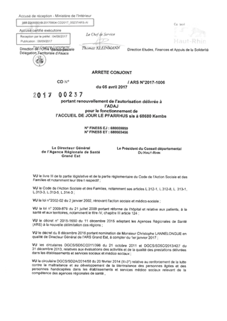 portant renouvellement de l'autorisation délivrée à l'ADAJ pour le fonctionnement de l'accueil de jour Le Pharrhus sis à 68680 KEMBS Resumé Pièces jointes ARRETE Assemblée : Non défini Date : 05/06/2017 Rapporteur : Non défini Collectivité : Conseil départemental du Haut-Rhin Direction : Non défini Service : Direction de la Solidarité Domaine : Personnes Agées Commission :