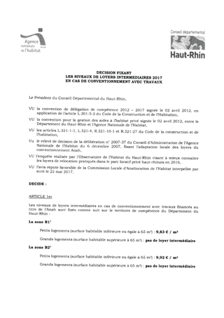 fixant les niveaux de loyers intermédiaires 2017 en cas de conventionnement avec travaux. Resumé Pièces jointes ARRETE Assemblée : Non défini Date : 07/06/2017 Rapporteur : Non défini Collectivité : Conseil départemental du Haut-Rhin Direction : Non défini Service : Direction Europe Attractivité et Aménagement Domaine : Autres (non classés) Commission :