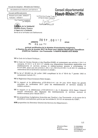 portant notification de la décision d'autorisation budgétaire et fixation du prix de journée 2017 du foyer pour adultes handicapés travailleurs (FAHT) de l'institut "Les Tournesols" à SAINTE MARIE AUX MINES Resumé Pièces jointes ARRETE Assemblée : Non défini Date : 08/06/2017 Rapporteur : Non défini Collectivité : Conseil départemental du Haut-Rhin Direction : Non défini Service : Direction Etudes, Finances et Appuis de la Solidarité Domaine : Prix de Journée Commission :