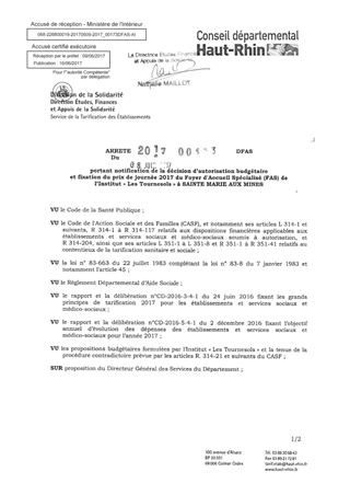 portant notification de la décision d'autorisation budgétaire et fixation du prix de journée 2017 du foyer d'accueil spécialisé (FAS) de l'institut "Les Tournesols" à SAINTE MARIE AUX MINES Resumé Pièces jointes ARRETE Assemblée : Non défini Date : 08/06/2017 Rapporteur : Non défini Collectivité : Conseil départemental du Haut-Rhin Direction : Non défini Service : Direction Etudes, Finances et Appuis de la Solidarité Domaine : Prix de Journée Commission :