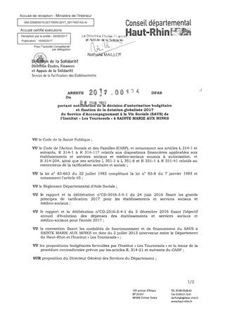 portant notification de la décision d'autorisation budgétaire et fixation de la dotation globalisée 2017 du service d'accompagnement à la vie sociale (SAVS) de l'institut "Les Tournesols" à SAINTE MARIE AUX MINES Resumé Pièces jointes ARRETE Assemblée : Non défini Date : 08/06/2017 Rapporteur : Non défini Collectivité : Conseil départemental du Haut-Rhin Direction : Non défini Service : Direction Etudes, Finances et Appuis de la Solidarité Domaine : Dotations financières Commission :