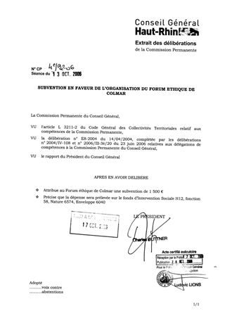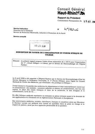 Le présent rapport propose l’octroi d’une subvention de 1 500 € pour l’organisation du 1er « Forum Ethique » à Colmar, par le Service de Neuroradiologie de l’Hôpital Pasteur.