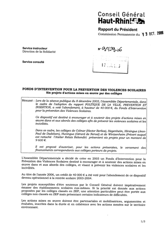 Lors de la séance publique du 8 décembre 2005, l'Assemblée Départementale, dans le cadre de l'adoption du rapport POLITIQUE DE LA VILLE, PREVENTION ET INSERTION, a voté l'abondement, à hauteur de 40 000 €, du Fonds d'Intervention pour la prévention des Violences Scolaires. Ce dispositif est destiné à encourager et à soutenir des projets d'actions mises en œuvre dans et aux abords des collèges afin de prévenir les violences scolaires et les incivilités. Dans ce cadre, les collèges de Colmar (Hector Berlioz), Hegenheim, Hirsingue (Jean-Paul de Dadelsen), Huningue (Gérard de Nerval) et de Wintzenheim (Prévert auquel est rattaché l’Atelier Relais Rebondir) présentent six projets pour un montant de 9 600 €. Il est proposé d'autoriser, pour les actions présentées, le versement des financements correspondants aux collèges porteurs de projets.