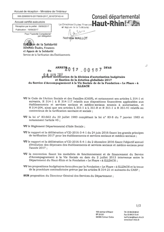 portant notification de la décision d'autorisation budgétaire et fixation de la dotation globalisée 2017 du service d'accompagnement à la vie sociale de la fondation "Le Phare" à ILLZACH Resumé Pièces jointes ARRETE Assemblée : Non défini Date : 08/06/2017 Rapporteur : Non défini Collectivité : Conseil départemental du Haut-Rhin Direction : Non défini Service : Direction Etudes, Finances et Appuis de la Solidarité Domaine : Dotations financières Commission :