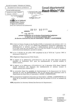 portant notification de la décision d'autorisation budgétaire et fixation de la dotation globalisée 2017 du service d'accueil de jour de l'association "AFAPEI" à BARTENHEIM Resumé Pièces jointes ARRETE Assemblée : Non défini Date : 08/06/2017 Rapporteur : Non défini Collectivité : Conseil départemental du Haut-Rhin Direction : Non défini Service : Direction Etudes, Finances et Appuis de la Solidarité Domaine : Dotations financières Commission :