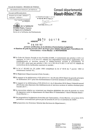 portant notification de la décision d'autorisation budgétaire et fixation du prix de journée 2017 du foyer pour adultes handicapés travailleurs de l'association "Croix-Marine" à WITTENHEIM Resumé Pièces jointes ARRETE Assemblée : Non défini Date : 08/06/2017 Rapporteur : Non défini Collectivité : Conseil départemental du Haut-Rhin Direction : Non défini Service : Direction Etudes, Finances et Appuis de la Solidarité Domaine : Prix de Journée Commission :