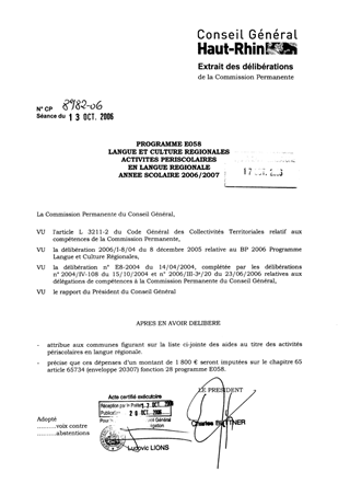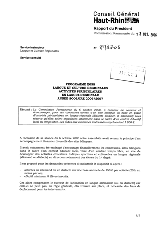 La Commission Permanente du 6 octobre 2000, a convenu de soutenir et d’encourager, pour les communes dotées d’un site bilingue, la mise en place d’activités périscolaires en langue régionale (dialecte alsacien et allemand) sous réserve qu’elles soient organisées notamment dans le cadre d’un contrat éducatif local ou temps libre. Les aides aux communes intéressées représentent 1 800 €.