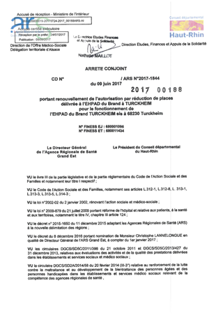 portant renouvellement de l'autorisation par réduction de places délivrée à l'EHPAD du Brand à TURCKHEIM pour le fonctionnement de l'EHPAD du Brand TURCKHEIM sis à 68230 TURCKHEIM Resumé Pièces jointes ARRETE Assemblée : Non défini Date : 09/06/2017 Rapporteur : Non défini Collectivité : Conseil départemental du Haut-Rhin Direction : Non défini Service : Direction de la Solidarité Domaine : Personnes Agées Commission :