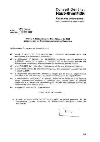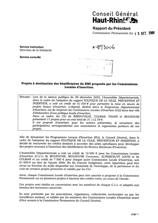 Lors de la séance publique du 08 décembre 2005, l'Assemblée Départementale, dans le cadre de l'adoption du rapport POLITIQUE DE LA VILLE, PREVENTION ET INSERTION, a voté un crédit de 61 000 € pour permettre la mise en œuvre de projets locaux d'insertion. L'objectif, décliné dans le Programme Départemental d'Insertion, est de renforcer les Commissions Locales d'Insertion (CLI) dans leur rôle d'élaboration d'une politique locale d'insertion. Dans ce cadre, les CLI de RIBEAUVILLÉ, COLMAR, THANN et MULHOUSE présentent 11 projets pour un coût total de 31 112.78 €. Il est proposé d'autoriser, pour les actions présentées, le versement des participations correspondantes aux associations et organismes porteurs de ces projets.