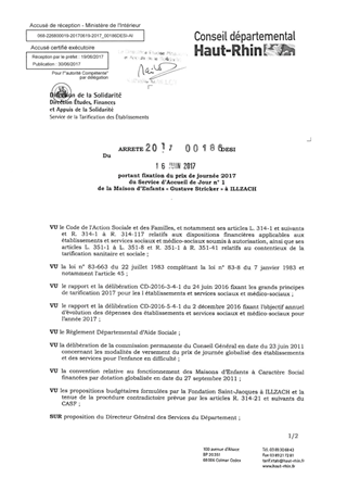 portant fixation du prix de journée 2017 du service d'accueil de jour n° 1 de la maison d'enfants "Gustave Stricker" à ILLZACH Resumé Pièces jointes ARRETE Assemblée : Non défini Date : 16/06/2017 Rapporteur : Non défini Collectivité : Conseil départemental du Haut-Rhin Direction : Non défini Service : Direction de la Solidarité Domaine : Prix de Journée Commission :