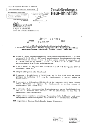portant notification de la décision d'autorisation budgétaire et fixation du prix de journée 2017 du foyer pour adultes handicapés travailleurs "Relais Adélaïde" de l'association "Adèle de Glaubitz" à COLMAR Resumé Pièces jointes ARRETE Assemblée : Non défini Date : 16/06/2017 Rapporteur : Non défini Collectivité : Conseil départemental du Haut-Rhin Direction : Non défini Service : Direction de la Solidarité Domaine : Prix de Journée Commission :