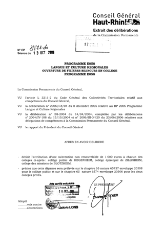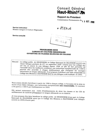 Le collège public de HEGENHEIM, le Collège Episcopal de ZILLISHEIM ouvrent une classe bilingue paritaire de 6ème en septembre 2006. Comme pour les collèges qui ont mis en œuvre la voie bilingue depuis 1998 ,et afin de leur permettre de l’accueillir dans les meilleures conditions, une subvention exceptionnelle de 1 000 €, pourrait être accordée à chaque établissement afin d’acquérir les ouvrages nécessaires en langue allemande. Il est proposé d’attribuer une aide comparable au Collège des Missions à BL0TZHEIM dont la voie bilingue a été instituée en 2005.