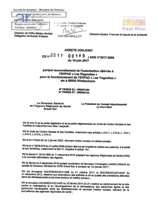 portant renouvellement de l'autorisation délivrée à l'EHPAD "Les Magnolias" pour le fonctionnement de l'EHPAD "Les Magnolias" sis à 68920 WINTZENHEIM Resumé Pièces jointes ARRETE Assemblée : Non défini Date : 19/06/2017 Rapporteur : Non défini Collectivité : Conseil départemental du Haut-Rhin Direction : Non défini Service : Direction de la Solidarité Domaine : Personnes Agées Commission :
