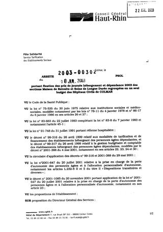 portant fixation des prix de journée hébergement et dépendance 2003 des sections Maison de Retraite et Soins de Longue Durée regroupées en un seul budget des hôpitaux civils de COLMAR. Resumé Pièces jointes ARRETE Assemblée : Non défini Date : 18/07/2003 Rapporteur : Non défini Collectivité : Conseil départemental du Haut-Rhin Direction : Non défini Service : Service de la Tarification des Etablissements Domaine : Prix de Journée Commission :