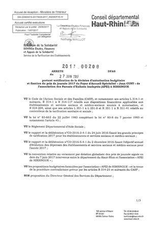 portant notification de la décision d'autorisation budgétaire et fixation du prix de journée 2017 du foyer d'accueil spécialisé "Jean CUNY" de l'association des parents d'enfants inadaptés (APEI) à HIRSINGUE Resumé Pièces jointes ARRETE Assemblée : Non défini Date : 27/06/2017 Rapporteur : Non défini Collectivité : Conseil départemental du Haut-Rhin Direction : Non défini Service : Direction de la Solidarité Domaine : Prix de Journée Commission :