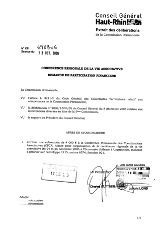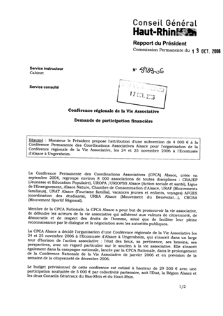 Monsieur le Président propose l'attribution d'une subvention de 4 000 € à la Conférence Permanente des Coordinations Associatives Alsace pour l'organisation de la Conférence régionale de la Vie Associative, les 24 et 25 novembre 2006 à l'Ecomusée d'Alsace à Ungersheim.
