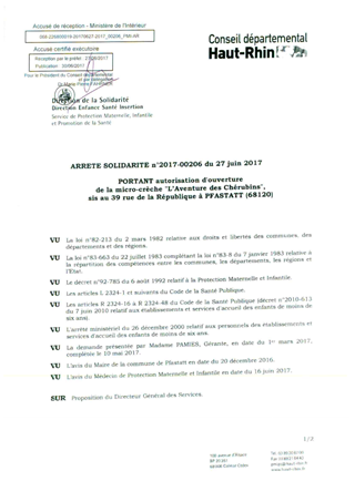 portant autorisation d'ouverture de la micro-crèche "L'Aventure des Chérubins", sis au 39 rue de la République à PFASTATT (68120) Resumé Pièces jointes ARRETE Assemblée : Non défini Date : 27/06/2017 Rapporteur : Non défini Collectivité : Conseil départemental du Haut-Rhin Direction : Non défini Service : Direction de la Solidarité Domaine : Accueil d'enfants Commission :