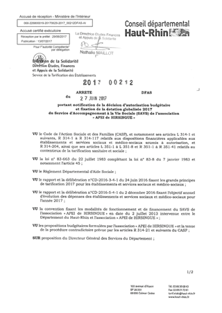 portant notification de la décision d'autorisation budgétaire et fixation de la dotation globalisée 2017 du service d'accompagnement à la vie sociale (SAVS) de l'association "APEI de HIRSINGUE" Resumé Pièces jointes ARRETE Assemblée : Non défini Date : 27/06/2017 Rapporteur : Non défini Collectivité : Conseil départemental du Haut-Rhin Direction : Non défini Service : Direction de la Solidarité Domaine : Dotations financières Commission :