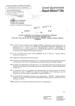 portant notification de la décision d'autorisation budgétaire et fixation de la dotation globalisée 2017 du service d'accueil de jour de l'association "ADAPEI - Papillons Blancs d'Alsace" à SOULTZ Resumé Pièces jointes ARRETE Assemblée : Non défini Date : 03/07/2017 Rapporteur : Non défini Collectivité : Conseil départemental du Haut-Rhin Direction : Non défini Service : Direction de la Solidarité Domaine : Dotations financières Commission :