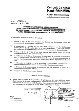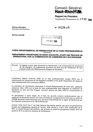 Ce rapport a pour objet d'autoriser le reversement, à la communauté de communes de l'Ile Napoléon, du prélèvement prioritaire de droit issu de l'écrêtement de taxe professionnelle des Etablissements Peugeot de Sausheim.